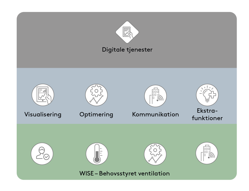 WISE indeholder altid en basispakke, som gør det muligt at opnå et behovsstyret indeklima. Ud over grundpakken kan der tilføjes en række løsninger, som f.eks. visualisering, optimering, kommunikation og diverse funktionaliteter. Udover dette kan der også tilføjes en række digitale tjenester:​