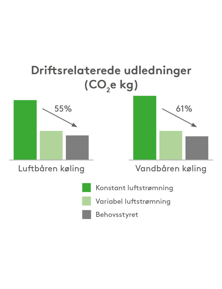 Mindre energiforbrug betyder også et lavere klimaaftryk. Med en behovstyret løsning kan CO2-udledningen reduceres med op til 61 %, hvilket gør det til en effektiv måde at bidrage til en mere bæredygtig fremtid på.
