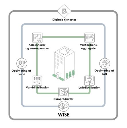 Med WISE er det som udgangspunkt muligt at styre alle elementer i et klimasystem, herunder ventilationsaggregater og klimaprodukter. Derudover kan WISE også styre optimering af vand og luft. Endvidere er det muligt at tilføje digitale tjenester, hvor produkters og egenskabers data kan visualiseres og administreres.