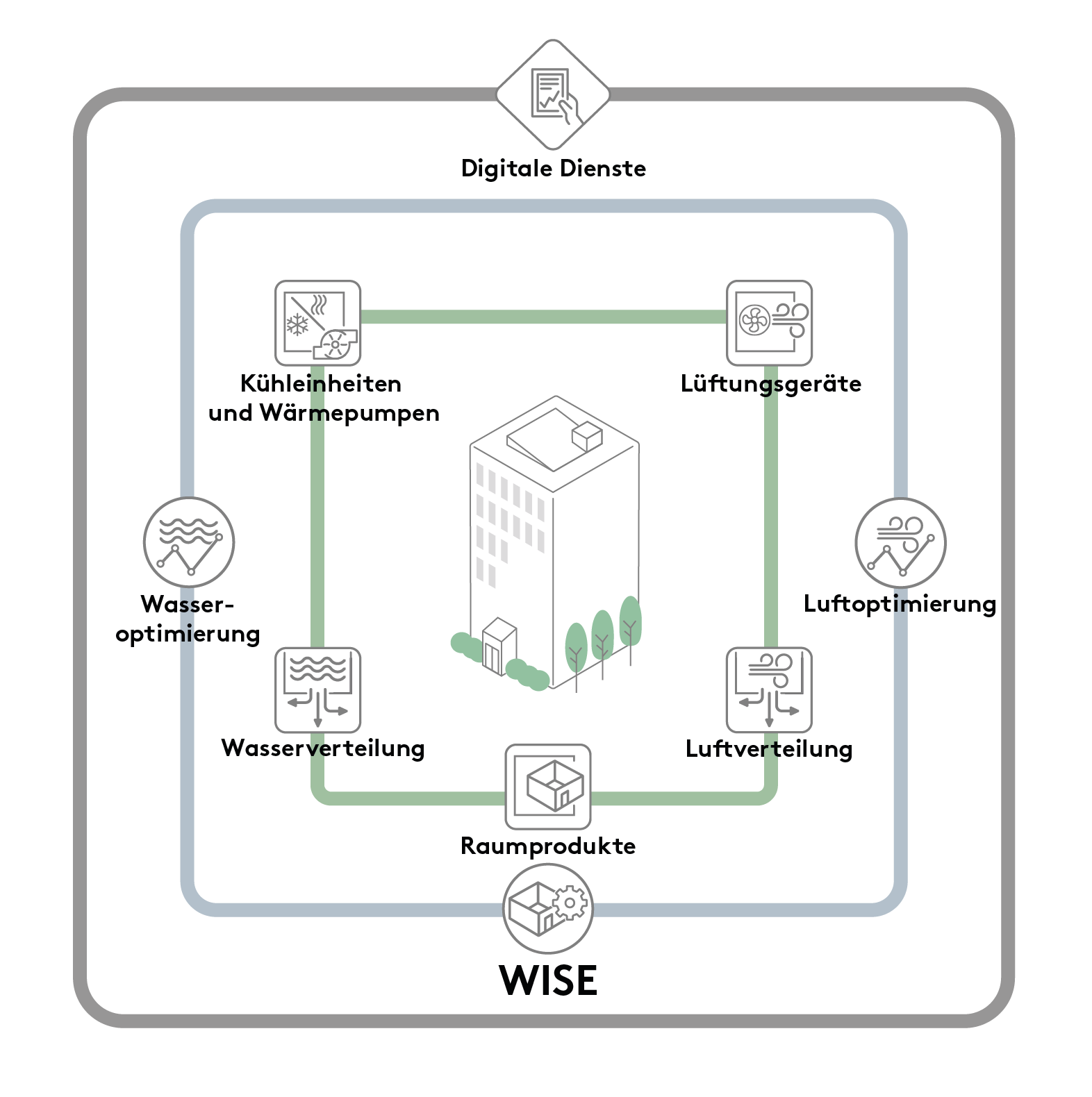 Bei Verwendung von WISE ist es im Grunde möglich, alle Bestandteile eines Klimasystems wie Lüftungsgeräte und Klimaprodukte zu steuern. Ergänzend kann WISE auch die Optimierung von Wasser und Luft steuern. Außerdem können digitale Dienste hinzugefügt werden, mit deren Hilfe Produkt- und Immobiliendaten visualisiert und verwaltet werden können.