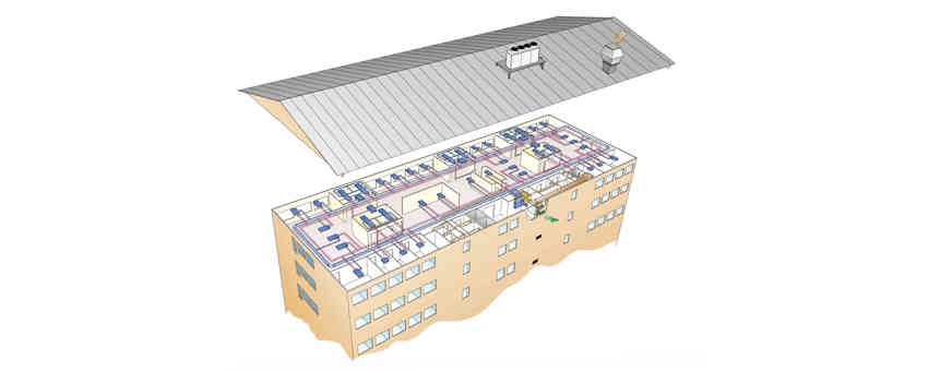 Bei mehrgeschossigen Bürogebäuden installiert man ein Klimasystem pro Etage, um für eine gute Luftqualität und ein geeignetes Raumklima zu sorgen. Mittels Druckregelung über eine Kommunikationseinheit sorgen die Lüftungsgeräte für einen exakt auf die Bedürfnisse abgestimmten Luftvolumenstrom. Durch eine Funktion zur Steuerung des Primärwasserkreislaufs wird die Wassertemperatur für Kühlung und Heizung optimiert. Raumgesteuerte Komfortmodule garantieren dann die gewünschte Temperatur in jedem Raum.