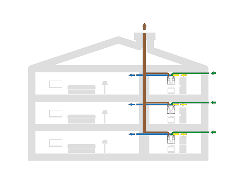 Mit Geräten in den Wohneinheiten und einer Bedarfssteuerung kann die Lüftung weitestgehend an die Bedürfnisse des Wohnbereichs angepasst werden. Die bedarfsgesteuerte Lüftung, die in der Regel in Schulen und Büros eingesetzt wird, wird auch immer häufiger in Wohnhäusern verwendet.