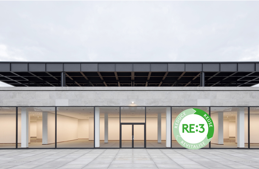 Das RE:3-Konzept besteht aus drei Fokus-Initiativen zum Reduzieren des verkörperten Kohlenstoffs, die sich auf die drei Schlüsselprinzipien der Kreislaufwirtschaft konzentrieren. Das RE:3-Symbol ist jedoch keine Zertifizierung, sondern eine Kennzeichnung, die Produkte mit einem besonders niedrigen Anteil an verkörpertem Kohlenstoff in einem Gebäude ausweisen.