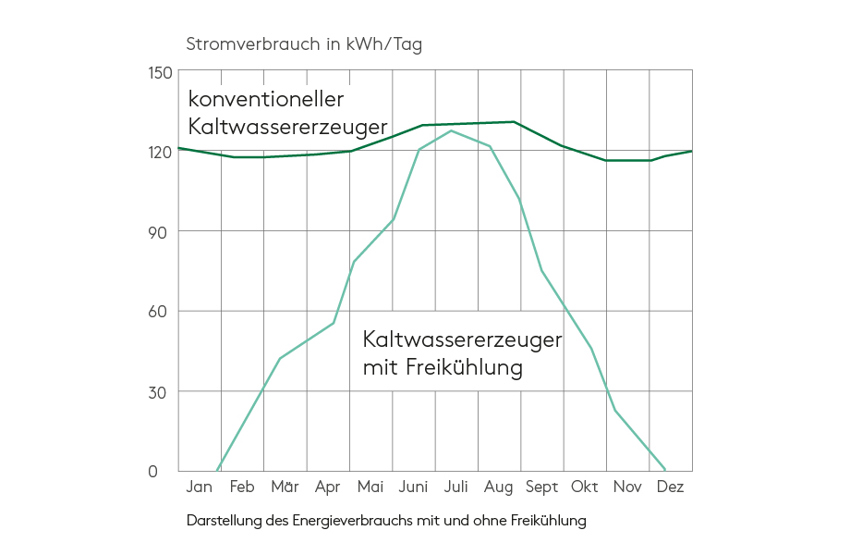 Bereits bei Außentemperaturen von 5 °C sinken durch die verminderte Leistungsaufnahme eines Kaltwassererzeugers mit gleitender Freikühleinrichtung die Betriebskosten um über 50 %.