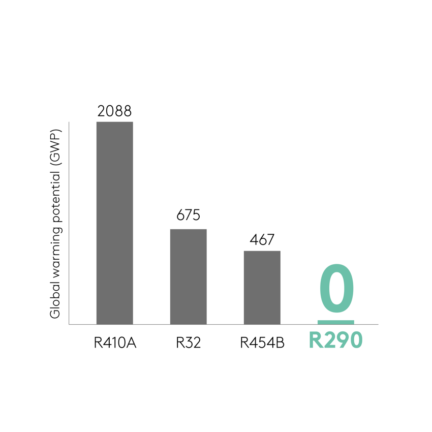 Seine Eigenschaften als Kältemittel ähneln dem synthetischen Kältemittel R22, sein Temperaturverhalten ist mit dem von R134a vergleichbar. Ein Beispiel: Swegon setzt Propan im Kühlfall energieeffizient für Vorlauftemperaturen zwischen -10 °C und +18 °C ein. Wie bereits erläutert, setzt die neue F-Gase-Verordnung** der Verwendung umweltschädlicher Kältemittel immer engere Grenzen, und auch auf globaler Ebene werden Klimaziele verschärft. Warum ist dies für die Verwendung von Propan wichtig? Das Kältemittel R290 hat einen sehr geringen Umwelteinfluss; Experten gehen davon aus, dass nur noch Kältemittel mit einem GWP unter 150 (wirtschaftlich) langfristig zukunftssicher sind.