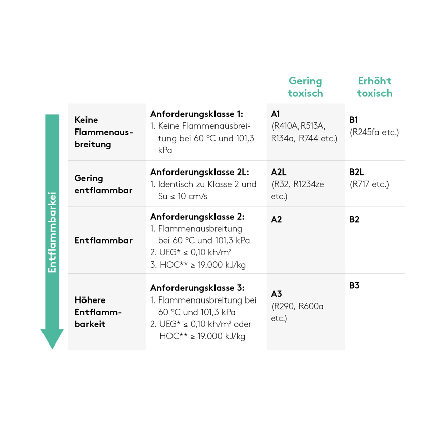 Die Kältemittel werden mit Buchstaben nach Giftigkeit (Toxizität) und mit Zahlen nach Brennbarkeit klassifiziert und durch weitere Kennwerte gekennzeichnet. Ein niedriger GWP (GWP < ca. 600) bedeutet meistens den Schritt weg von der Sicherheitsklasse A1 hin zu A2L- (schwer entflammbar) oder A3- (leicht entflammbar) Kältemitteln. Natürliche Kältemittel wie Ammoniak (R717, B2L) oder Propan (R290, A3) werden bereits seit Jahrzehnten in der Kältetechnik eingesetzt und sind in bestimmten Einsatzgebieten eine bewährte und effiziente Lösung. Bei diesen Kältemitteln gelten die gleichen Normen und Verordnungen wie bei den bislang verwendeten A1-(„Sicherheits“-) Kältemitteln.