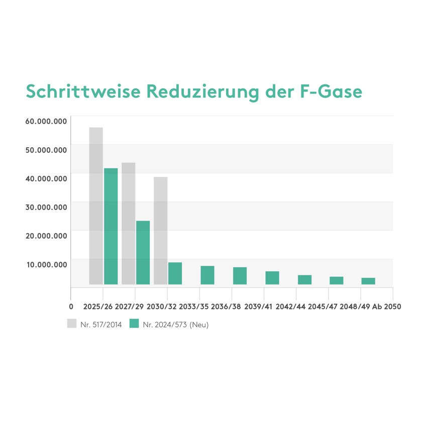 Der Ausstieg aus den F-Gasen wird durch einen verschärften Phase-down nun deutlich beschleunigt. In der EU-Verordnung von 2015 wurde der Phase-down bis 2032 festgelegt. Dieser wird mit der neuen Verordnung noch einmal verschärft; Ziel ist ein vollständiger Phase-out bis 2050, d. h. das Inverkehrbringen von CO2-Äquivalenten durch den Einsatz von HFKW-Kältemitteln soll stufenweise auf null zurückgehen. Aus dem Phase-down wird also ein Phase-out. Kältemittel mit einem hohen GWP-Wert verschwinden sukzessive vom Markt; klimafreundlichere, aber brennbare Kältemittel gewinnen an Bedeutung. Im Jahr 2040 soll aber noch einmal überprüft werden, ob der Phase-out realistischerweise so eingehalten werden kann.