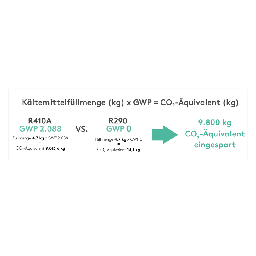Der GWP-Wert eines Kältemittels definiert dessen relatives Treibhauspotenzial in Bezug auf CO2 (auch als CO2-Aquivalent bezeichnet). CO2 dient als Referenzgas mit einem GWP von 1. Der Wert beschreibt die Erderwärmungswirkung über einen bestimmten Zeitraum, bei Kältemitteln in der Regel über 100 Jahre. Ein höherer GWP-Wert zeigt also an, dass ein Gas eine stärkere Klimawirkung pro Einheit hat. Ein Beispiel: Das hauptsachlich zur Kühlung von gekühlten und tiefgekühlten Lebensmitteln eingesetzte Kältemittel R404A hat einen GWP von 3.922. Seine Klimawirkung ist also 3.922 mal stärker als die von CO2. Im direkten Vergleich von synthetischen und natürlichen Kältemitteln ergibt sich daher, wie groß die Unterschiede bei den CO2-Äquivalenten ausfallen.