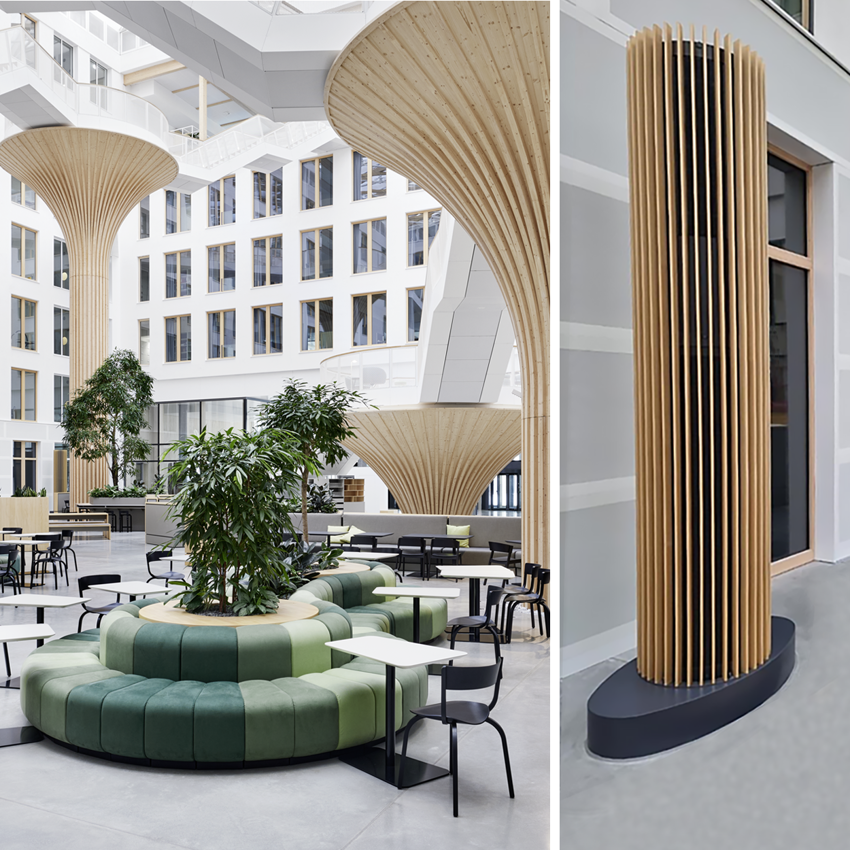 Der Bauherr stellte besondere Anforderungen an Lobby, Atrium und Halle. Sie sollten einen Wald darstellen, der die Nachhaltigkeit des gesamten Gebäudes hervorhebt. Zudem sollte die Lobby offen und luftig wirken. Aus diesem Grund gestaltete der Architekt sie mit vier in der Höhe abgestuften, holzverkleideten Säulen, verbunden durch Stege und Treppenläufe.