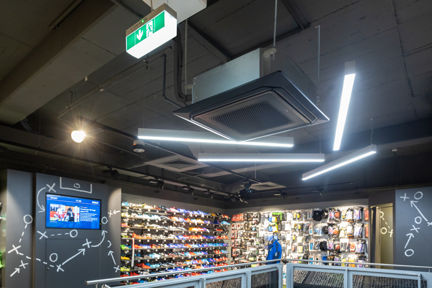 In dem Intersport inDelmenhorst gab es ein paar Herausforderungen: Der Betreiber wollte sein dunkles Raumdesign nicht durch sichtbare Technik stören lassen. Die Räume sind dunkel gestaltet, haben aber gleichzeitig sehr viel Lichtspiel und schwarz-graue Wände und Decken. Der Ladenbetreiber wollte unverkleidete Geräte und sein altes System aus den 90ern auf einen zeitgemäßen technischen Stand bringen. Außerdem war ihm natürlich eine schnellstmögliche Umsetzung und ein attraktives Preis-/ Leistungsverhältnis wichtig. Zudem bekam der Shop nur zwei Innengeräte, aber die Luftverteilung sollte doch jeden letzten Winkel erreichen, damit kein Kunde trotz des Wärmeeintrags durch das Lichtkonzept schwitzt.