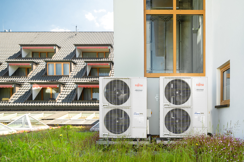 Die Außengeräte waren eine weitere Herausforderung – auch diese sollten das Schwarzwald-Idyll nicht stören. Der Platz vor Ort war gering, deshalb fiel die Wahl auf Fujitsu VRF-Außeneinheiten, welche seitlich ausblasen und durch die kompakte Bauart kaum auffallen. Diese platzsparenden Geräte verschwanden hinter einem Gartenhaus. Da das Gartenhaus im Bereich des Pools mit Liegefläche steht, mussten die Geräte zusätzlich noch sehr leise laufen, um die Gäste nicht zu stören. Weitere Geräte wurden auf einem begrünten Dach neben einem Treppenhaus installiert. Umgesetzt wurde das Projekt mit dem Handwerksbetrieb Fa. Thermorat Freiburg und dem langjährigen und erfahrenen Mitarbeiter Herrn Heitzler.
