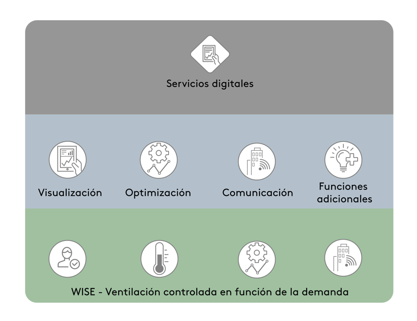 El objetivo principal de WISE es ajustar el clima interior exactamente al nivel necesario. No ventila, enfría ni calienta ni demasiado -lo que cuesta energía- ni demasiado poco -lo que afecta negativamente al confort-, sino sólo lo necesario. Con WISE se combinan la alta eficiencia energética, la optimización del funcionamiento, el clima interior ideal y una visión completa de todo el sistema.