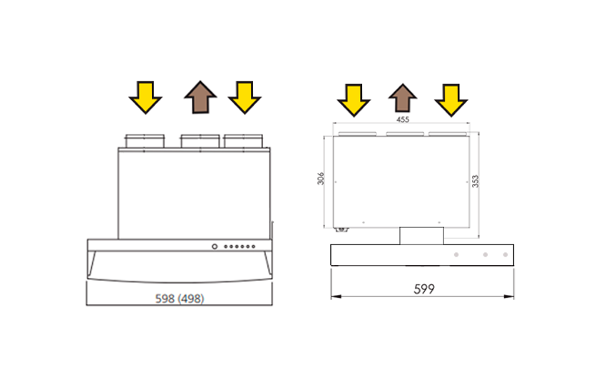 Kuvassa ILMO-talotuuletin sekä CASA R3 -ilmanvaihtokoneen oikeakätinen laite (R-malli) yhdistettynä Jazz-liesikupuun. Vasenkätisesssä R3-koneessa (L-malli) kanayhteiden järjestys on peilikuvana.