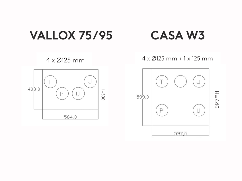 Huom. W3 xs on 84 mm matalampi mutta 196 mm syvempi kuin Vallox 75/95