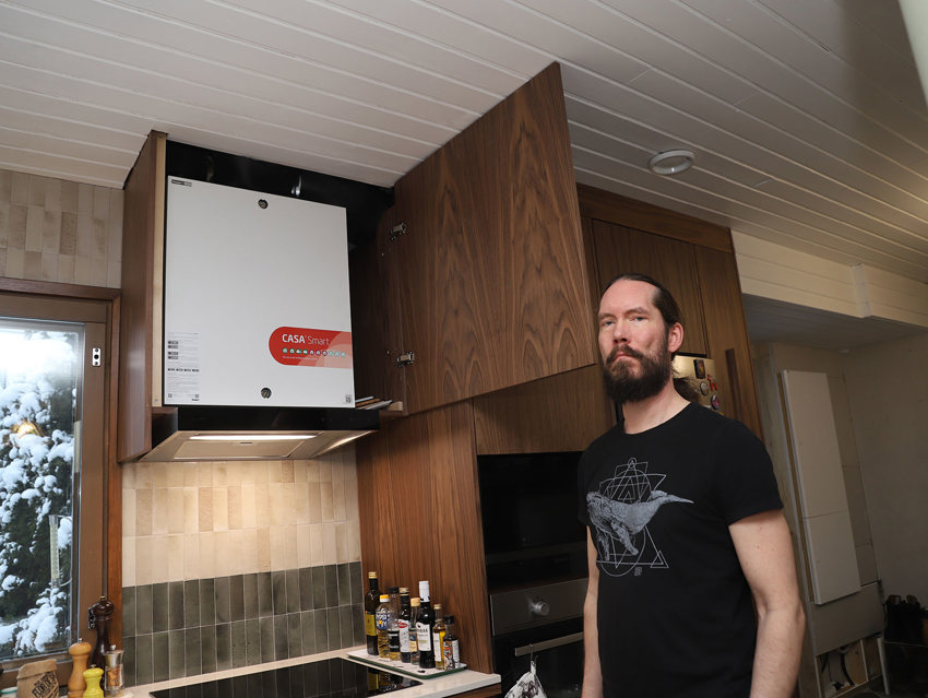- Kaikki kanavat piti saada mahtumaan keittiön kaapin yläsokkeliin. Tilat olivat ahtaat. Liesikupu olisi yleensä tullut suoraan iv-koneen alapuolelle, mutta nyt väliin tuli hyllytaso. Tarvitsimme sopivan mittaisen jatkopalan, joka istuikin hyvin ja imuteho oli riittävä, Salo kertoo.