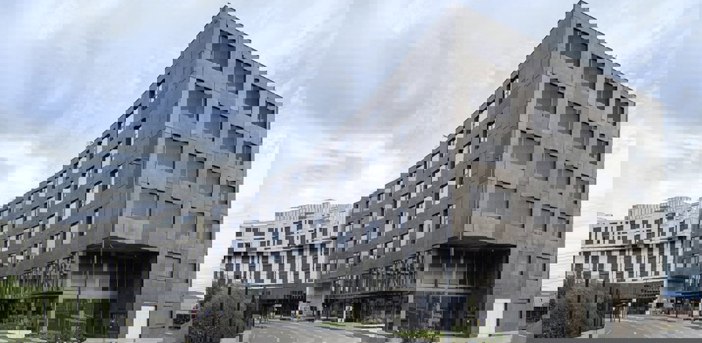 Situé sur un terrain de 11 668 mètres carrés délimité au nord par le coude de la rue de la Bergère et au sud par la station Zimeysa, le projet exploite au maximum la parcelle disponible et offre une surface brute de plancher de quelque 49 000 mètres carrés répartis sur six étages et un rez-de-chaussée. Trois niveaux souterrains sont dévolus aux parkings et aux locaux techniques. L’Atrium Airport Hotel 4 * prend place au cœur de l’ensemble et propose 163 chambres orientées vers le Jura ou le Salève, trois restaurants, un hall d’accueil de 400 m2, un centre de conférences modulable de 1 200 m2 ainsi qu’un fitness et spa. Le restaurant aménagé en attique dispose en outre d’une terrasse avec vue splendide sur le Salève.
