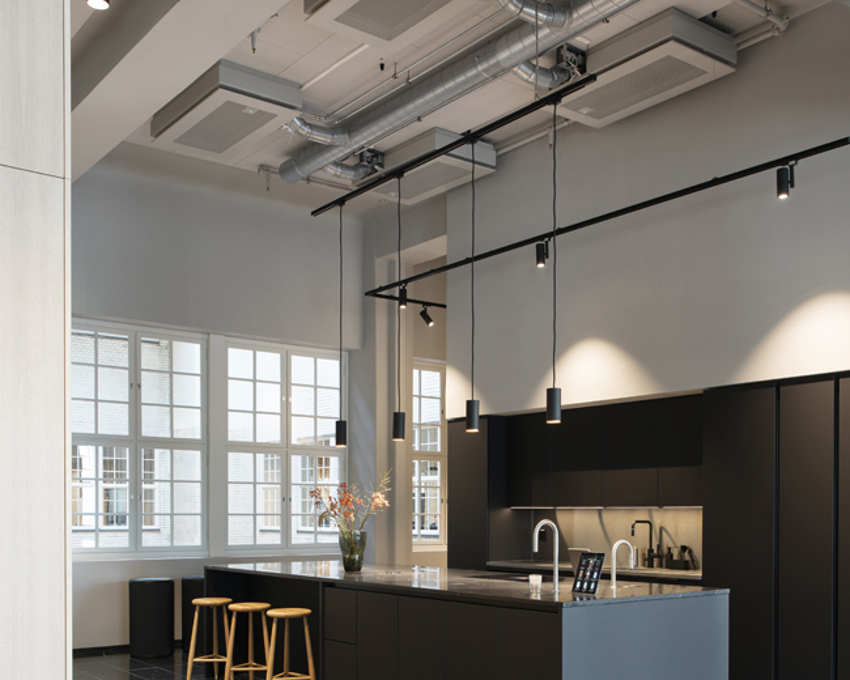 Dans le bâtiment, il y a une variation entre le plafond fermé et le plafond exposé, où la technologie est entièrement visible. Le module de confort WISE Parasol EX et le diffuseur d'air WISE Sphere Free, entre autres, sont exposés au plafond. Sur les murs, vous trouverez les produits WISE RTA qui permettent aux locataires de régler la température de consigne.