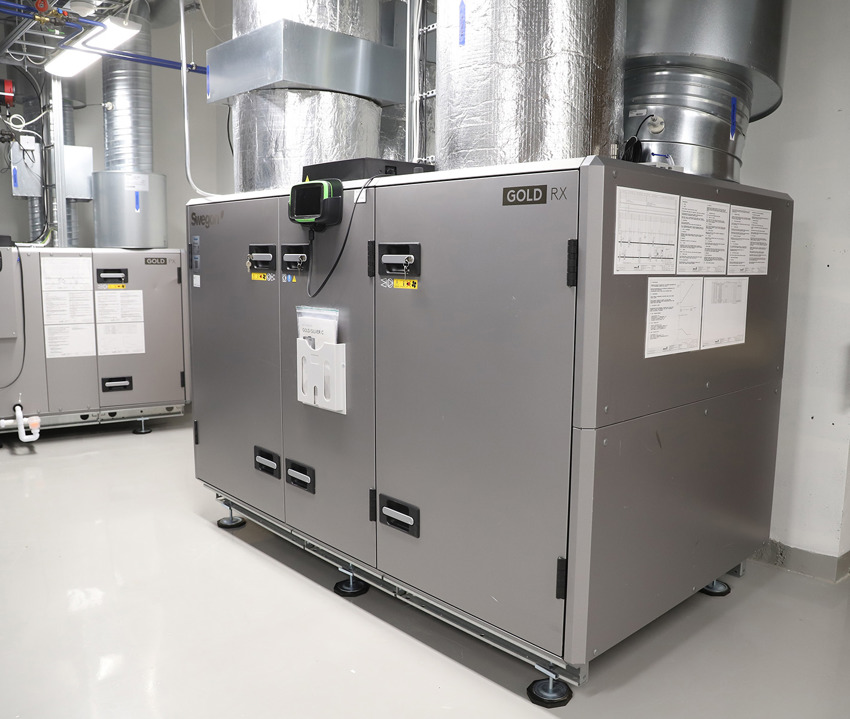 Et au cœur du système de ventilation du collège, on retrouve des centrales de traitement d’air double flux GOLD RX de Swegon, reconnues pour leur efficacité énergétique et leur faible niveau sonore. Ces unités, certifiées Passive House, offrent un rendement énergétique exceptionnel et contribuent à la performance globale du bâtiment.