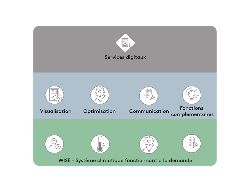 ​WISE comprend un pack de démarrage pour faire fonctionner le système climatique à la demande. Des solutions telles que la visualisation, l’optimisation, la communication et diverses fonctionnalités peuvent y être ajoutées. De même que des services en ligne :​