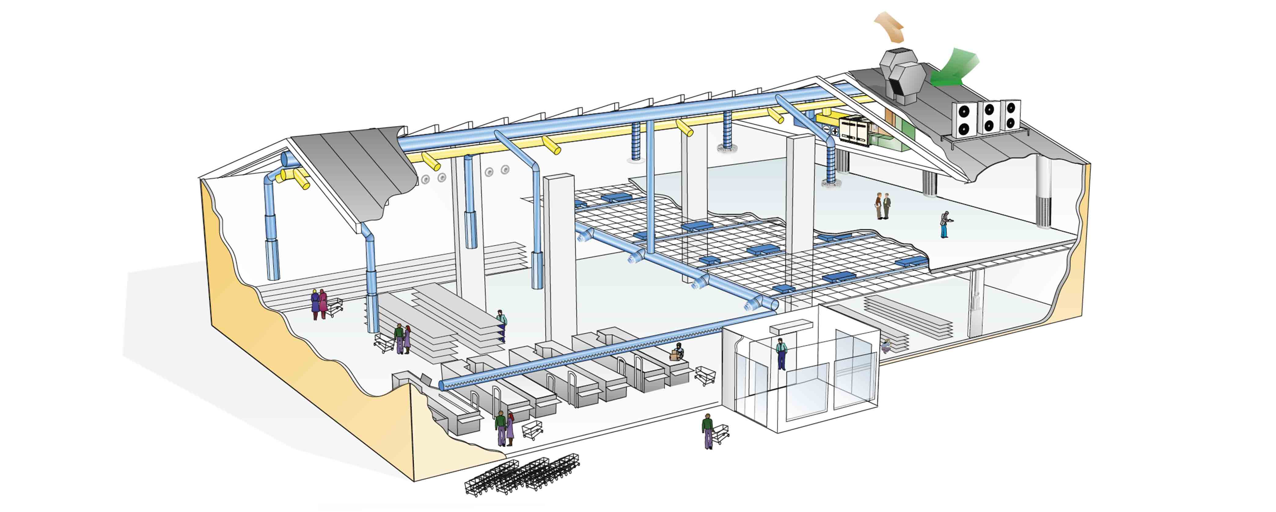 I grandi locali commerciali hanno in genere superfici calpestabili molto estese, soffitti alti e una climatizzazione interna impegnativa. La temperatura deve essere mantenuta costante per tutto l'anno, nonostante gli ambienti interni producano calore in eccesso per la maggior parte della giornata. Inoltre, in luoghi diversi dei locali sono presenti vere e proprie variazioni di temperatura. Le vetrate emettono radiazioni termiche, che compensano il calore in eccesso e possono necessitare di riscaldamento specifico nelle aree finestrate. Nel complesso, il quadro è complesso e rispondere a tutti i requisiti potrebbe non essere facile.