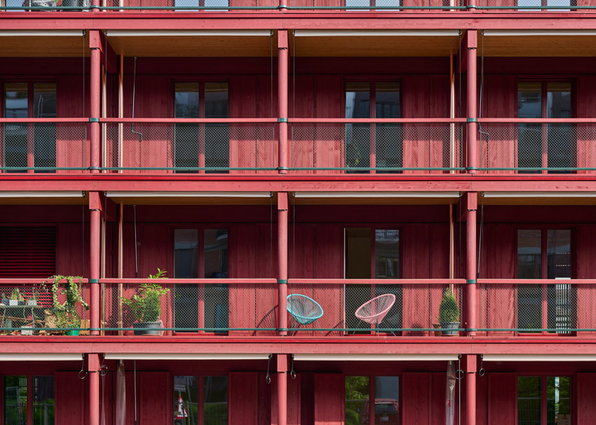 Il pergolato di accesso agli appartamenti favorisce i contatti sociali. L'architettura in legno forma l'ambiente di vita espressivo ma tranquillo che si addice allo standard. Le finestre a tutta altezza, semplicemente bellissime, a doppia anta in legno, permettono alla luce e al calore di inondare il piano, ma forniscono anche la distanza necessaria in questo contesto urbano. Piante in vaso, amache e mobili animano l'architettura della veranda e conferiscono alla forma leggerezza, convivialità e comfort.