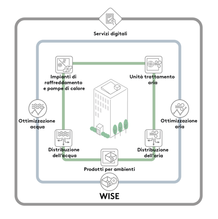 Utilizzando WISE in pratica, è possibile controllare tutti gli elementi in un sistema di climatizzazione, come ad esempio le unità di trattamento aria e i prodotti di climatizzazione. WISE può anche controllare l’ottimizzazione di aria e acqua. Inoltre è possibile aggiungere servizi digitali dai quali poter visualizzare e gestire i dati dei prodotti e delle proprietà.