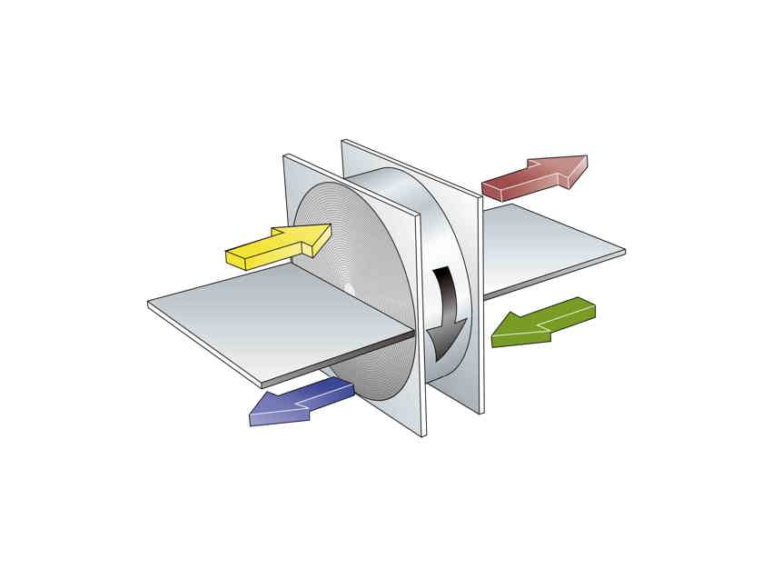 Un recuperatore di calore rotativo consiste di un disco rotante con una serie di piccoli canali di alluminio. L'aria di ripresa, più calda, riscalda i canali e trasferisce il calore all'aria di mandata, più fredda.