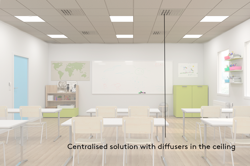 A decentralised solution, like a COMPACT Air unit, and a centralised system using diffusers in the ceiling are shown in the pictures below. The COMPACT unit may be fitted subtly into the corner of a classroom and provide the space with good air quality. The diffusers used with the centralised solution fits, in this case, smoothly into the ceiling and there are numerous kinds of diffusers available to chose from depending on the requrements in the classroom.