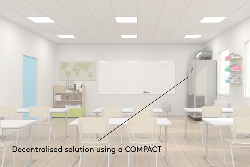 For example, a COMPACT Air or CLASS UNIT PX, can be placed directly in the class room against a wall or in the ceiling, which means no duct work is needed, providing unbeatably fast installation. This will provide fresh air into the room and extract the polluted air – but thanks to the built-in heat exchanger, the energy in the indoor air will not be wasted.