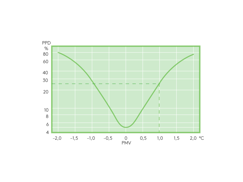 Based on PMV and PPD values defined in the ISO 7730 standard, requirements can be set for the thermal climate in a building. Depending on which PPD values are set as requirements and the activity levels and clothing factors incorporated in those requirements, the resulting criteria require the operative temperature to be in the range of 20-24 degrees in winter and 23-26 degrees in summer.Â