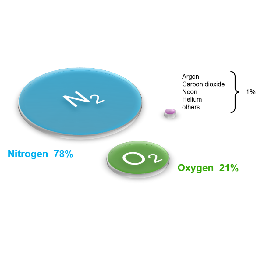 Dry air is made up of a mixture of gases. 78% is Nitrogen, 21% is Oxygen and the remaining 1% is made up of gases such as carbon dioxide, argon, neon, helium etc. Dry air is mixed with an amount of water vapour up to about 4%.