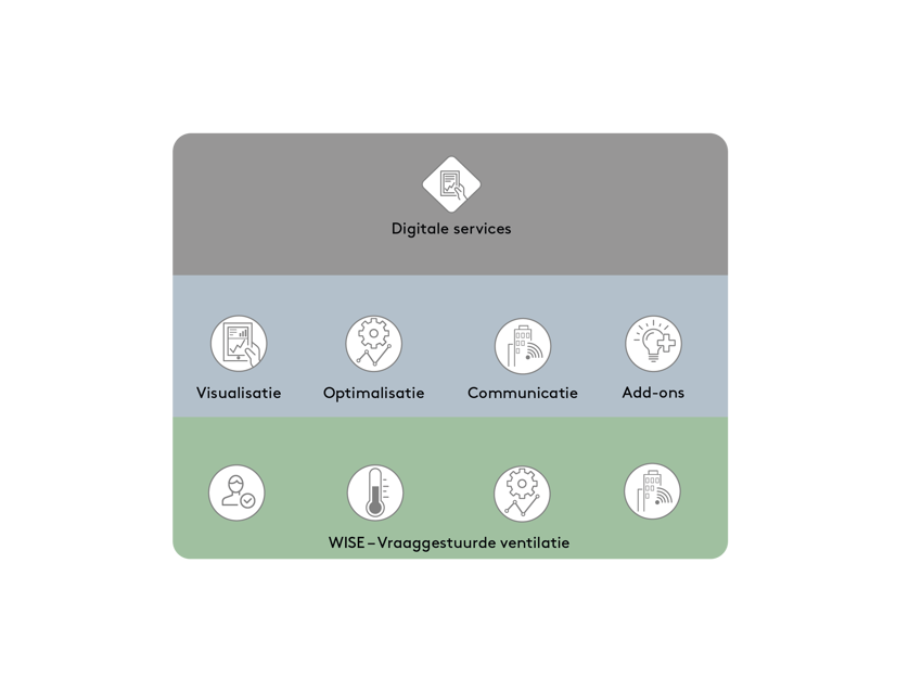 ​WISE bevat altijd een basispakket voor het bereiken van een vraaggestuurd binnenklimaat. Naast het basispakket kunnen er een aantal oplossingen worden toegevoegd, zoals visualisatie, optimalisatie, communicatie en verschillende functies. En dan is het ook nog mogelijk om een aantal digitale services toe te voegen, zoals:​