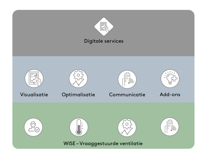 WISE is in principe bedoeld om het binnenklimaat exact af te stellen op het gewenste niveau. Het systeem ventileert, koelt en verwarmt precies zoveel als nodig is, d.w.z. niet te veel, omdat dat energie kost, maar ook niet te weinig, omdat dat een negatieve invloed heeft op het comfort. Met WISE profiteert u van energie-efficiëntie, optimale processen, het ideale binnenklimaat en een totaal overzicht van het volledige systeem.​