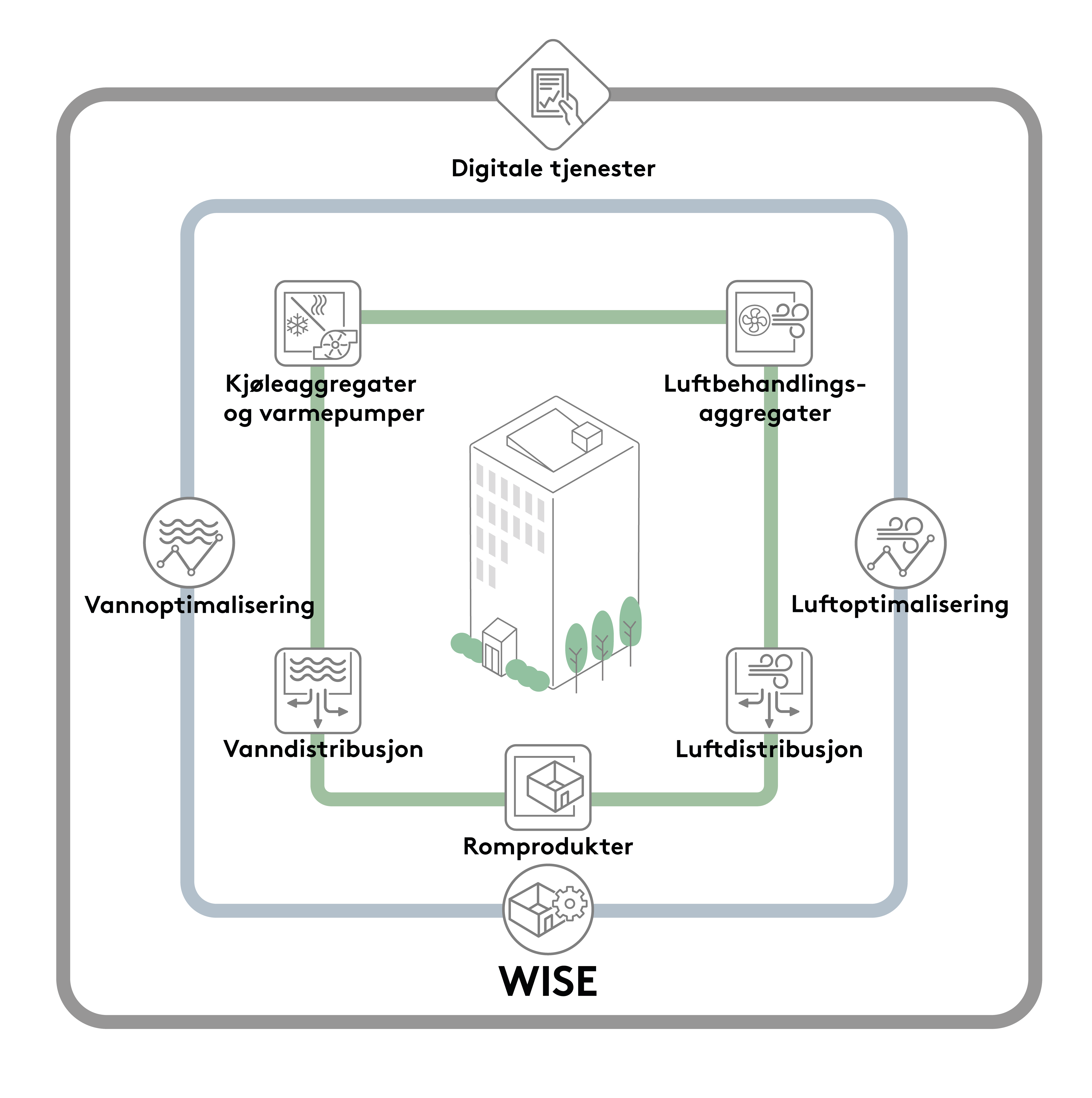 Ved hjelp av WISE er det i prinsippet mulig å styre alle elementene i et klimasystem, som luftbehandlingsaggregater og klimaprodukter. I tillegg kan WISE styre vann- og luftoptimalisering. Det er også mulig å legge til digitale tjenester, der data om produkter og eiendommer kan visualiseres og styres.