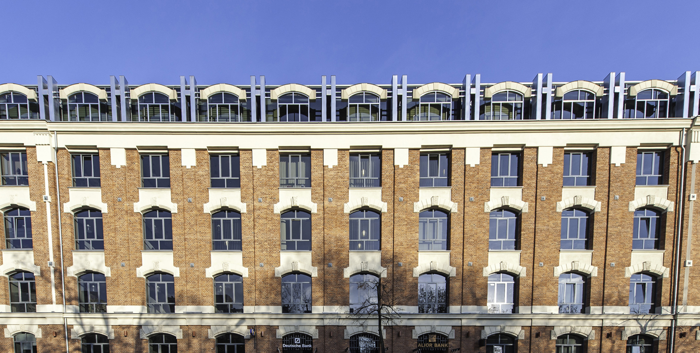 Wejście do głównego budynku zdobi podłoga wykonana z czarnego granitu i przeszklenia. Metalowe schody nawiązują do fabrycznej stylistyki. Ściany wyłożone są kamieniem naturalnym, a recepcja usytuowana w centralnym miejscu biurowca wykończona została polerowaną stalą nierdzewną i granitem.