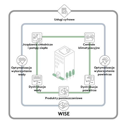 Za pomocą WISE możliwe jest sterowanie wszystkimi elementami systemu klimatyzacyjnego, takimi jak centrale klimatyzacyjne, moduły chłodzące i klimakonwektory indukcyjne. Ponadto WISE może sterować optymalizacją wody i powietrza. Opcjonalną funkcją jest także dodanie usług cyfrowych, w których można wizualizować dane produktów i ich właściwości oraz nimi zarządzać.