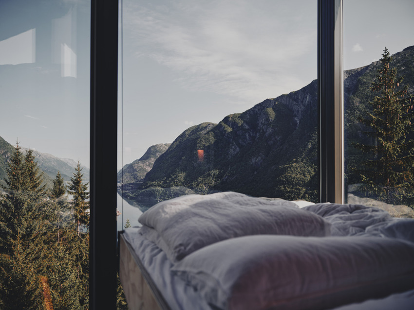 This construction project is nearly unique and it is certainly the opposite of any top of mind hotel structure thought of. Not only are these luxury treehouses neatly build completely in wood, they are also carefully seated in the tops of tall pine trees which rises along the mountain wall which frame the Hardanger fjord in Norway.