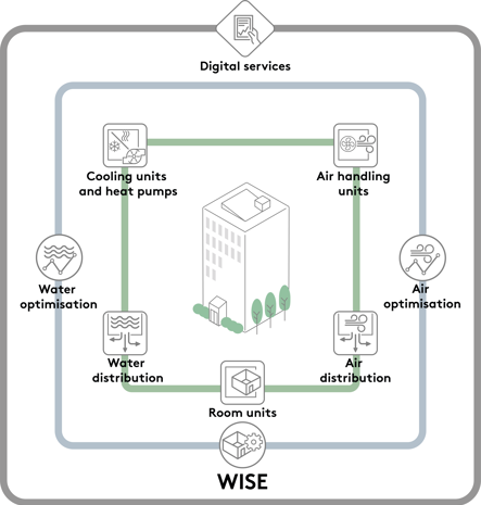 Using WISE, it is basically possible to control all the elements in a climate system, such as air handling units and climate products. In addition, WISE can also control water and air optimisation. Furthermore, it is possible to add digital services in which products’ and properties’ data can be visualised and managed.