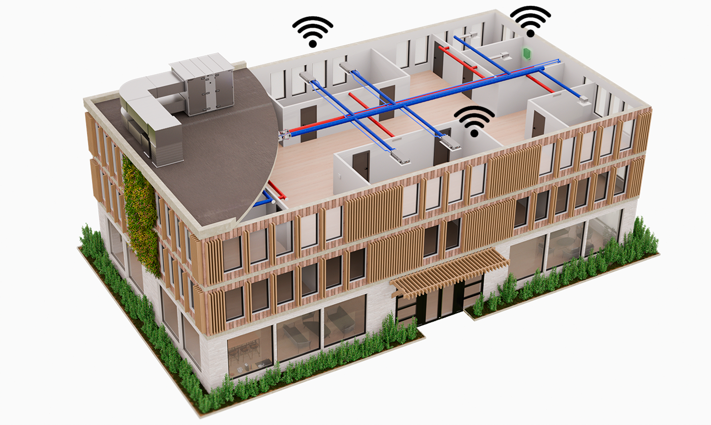 Complete system solution with demand controlled ventilation, wireless communication and energy optimisation.