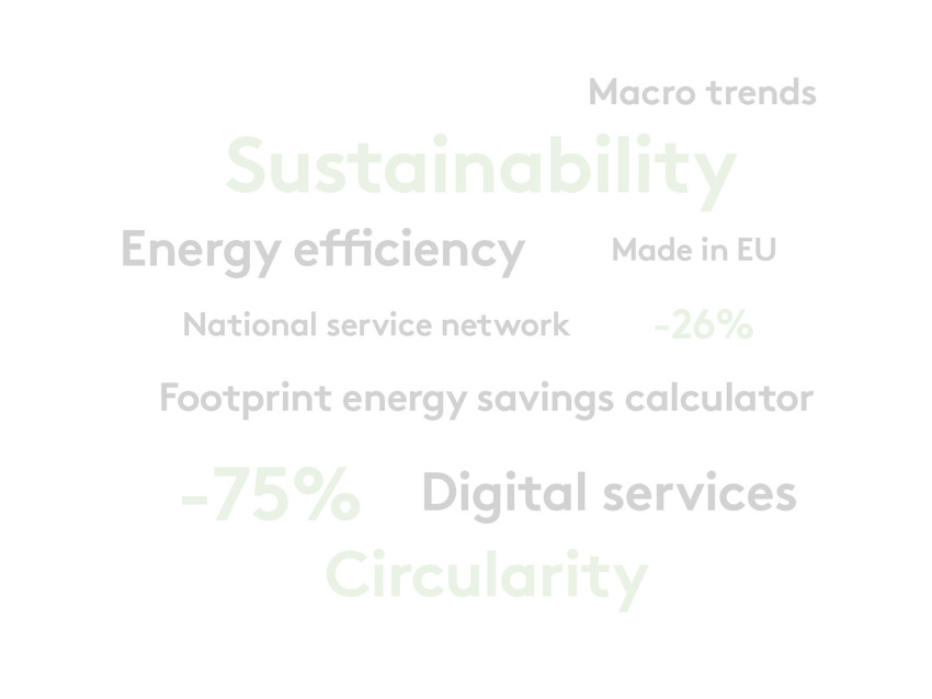 Our offering includes climate solutions for sustainable properties, circularity practices, a calculator for savings in energy and CO2 emissions as well as digital services for excellence in building management. Choose your topic of interest in the list below to read more: