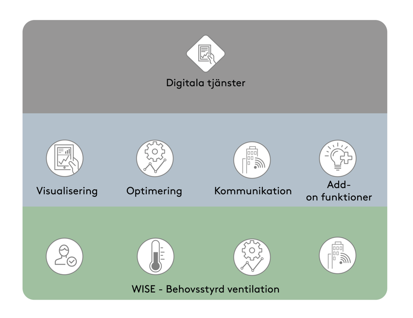 I WISE ingår alltid ett grundpaket till ett behovsstyrt inomhusklimat. Utöver grundpaketet finns en rad lösningar som kan läggas till, så som visualisering, optimering, kommunikation och funktionaliteter. Utöver detta kan en rad digitala tjänster även läggas till:​