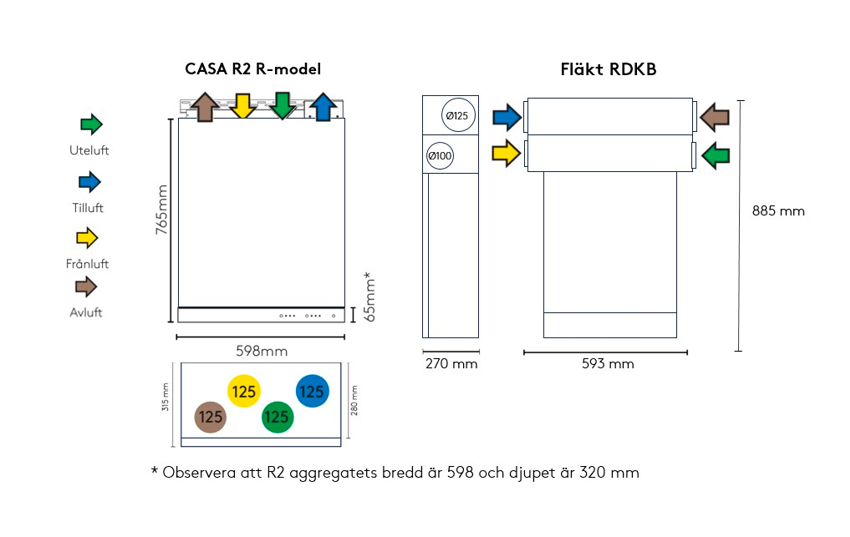 Den vänstra bilden visar ventilationsaggregatet Swegon CASA R2 (R-modell) i kombination med en Jazz-kåpa. Den högra visar Fläkt RDKB.