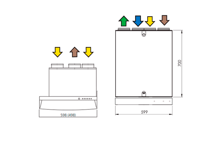 Den vänstra bilden visar en ILMO-kryddhyllefläkt och den högra bilden visar ventilationsaggregatet CASA R3 (R-modell) i kombination med en Jazz-kåpa. I den vänstra versionen av R3-aggregatet (L-modell) är placeringen av kanalanslutningarna spegelvända.
