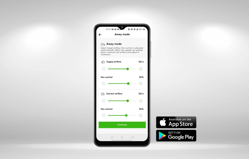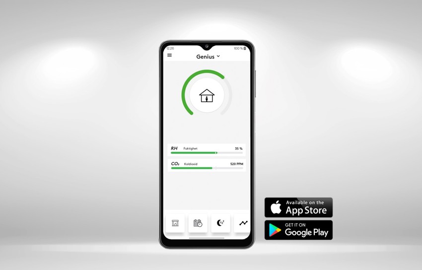 Med denna app kan bostadsinnehavaren använda alla funktioner i kontrollpanelen på distans från den egna smarttelefonen. Med hjälp av appen får användaren tillgång till mer information om bostadens luftkvalitet och värdefulla anvisningar och råd om ventilationen (behöver Swegon Genius -kontrollpanel).