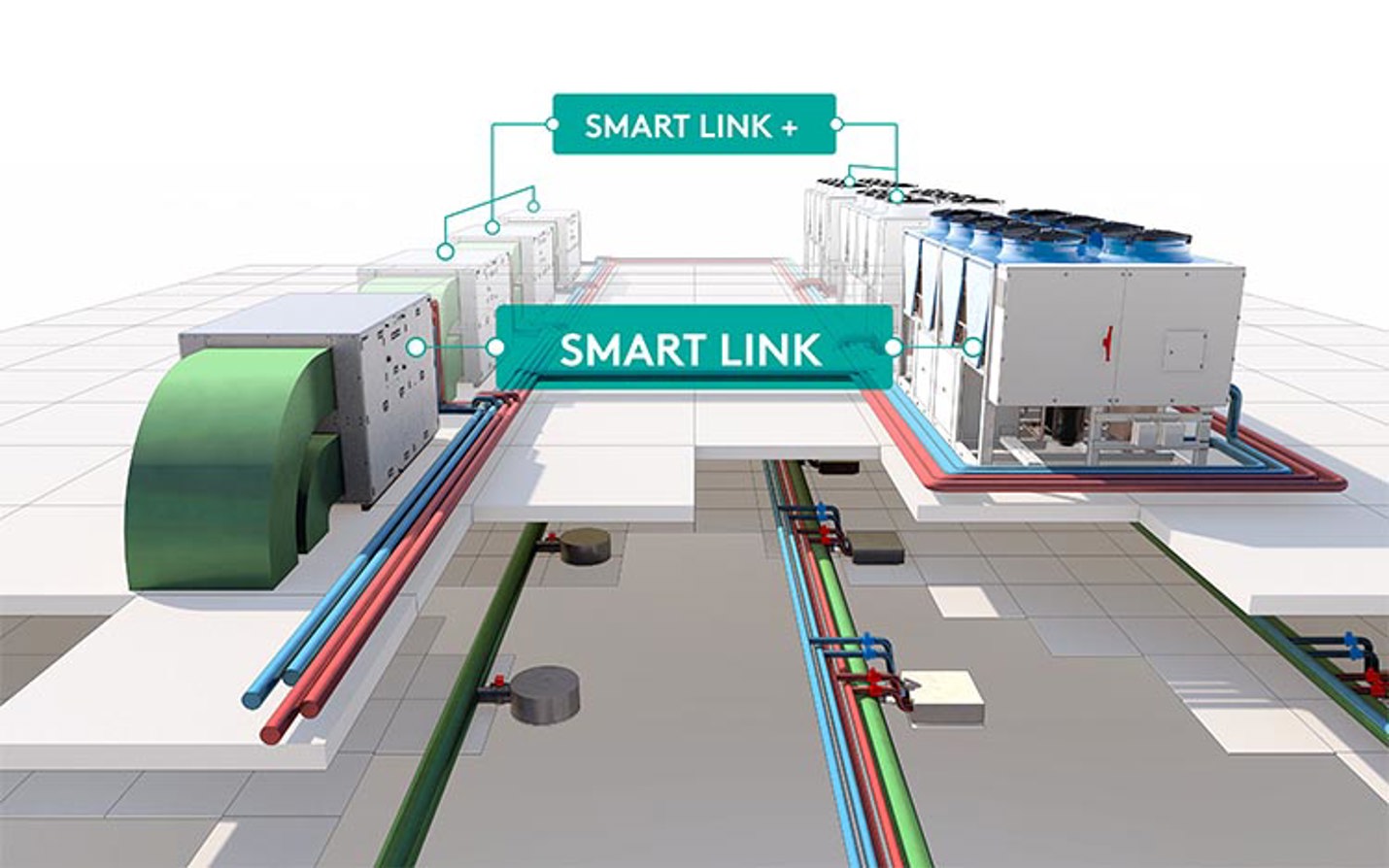 SMART Link+ är en enkel länk mellan luftbehandlingsaggregat och kyl- och värmeproduktion. Den förenklar styrningen av båda, från aggregatets styrgränssnitt, samtidigt som prestandan optimeras för avsevärda energibesparingar.
