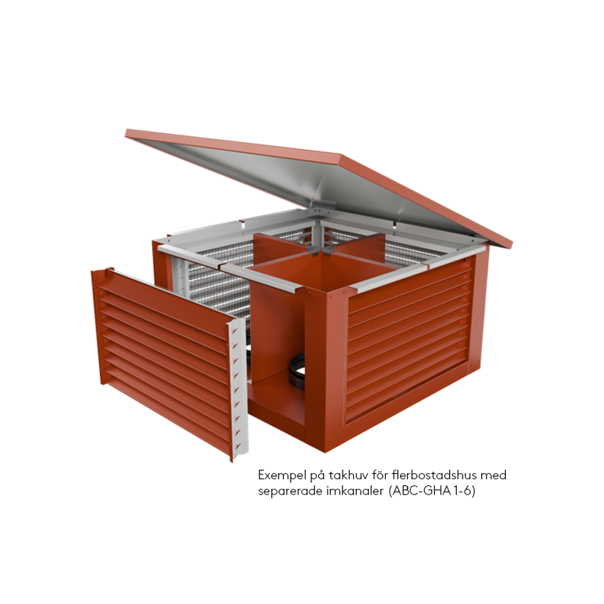 En rektangulär takhuv för större flöden som hanterar 2x uteluft eller 2x avluft beroende på modell.