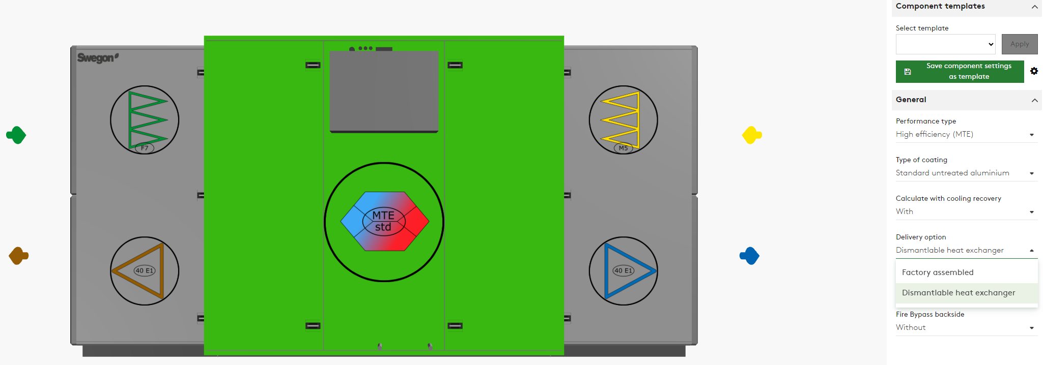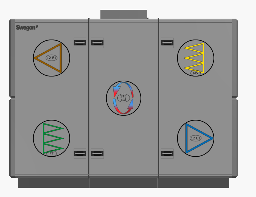 To facilitate all choices made on functional parts in AHU design, we have now introduced new detailed icons for fans, filters, and heat exchangers. These icons will display following: