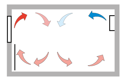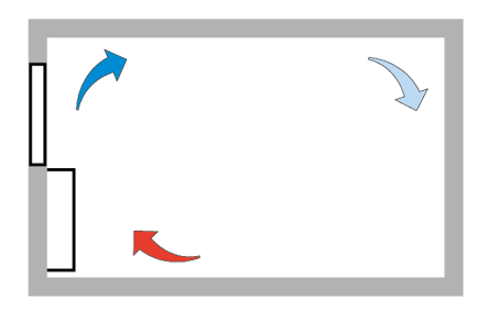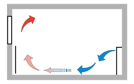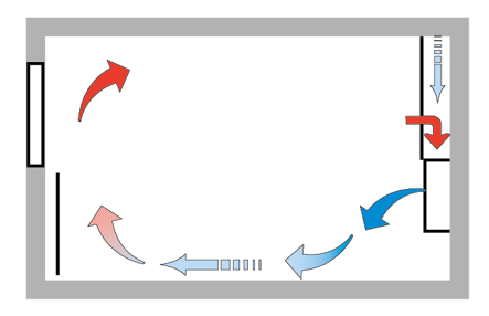 For supply air below room temperature, a satisfactory result from this method is usually obtained if the diffuser is scaled for a slightly longer throw length (1 to 2 m) than the room depth.