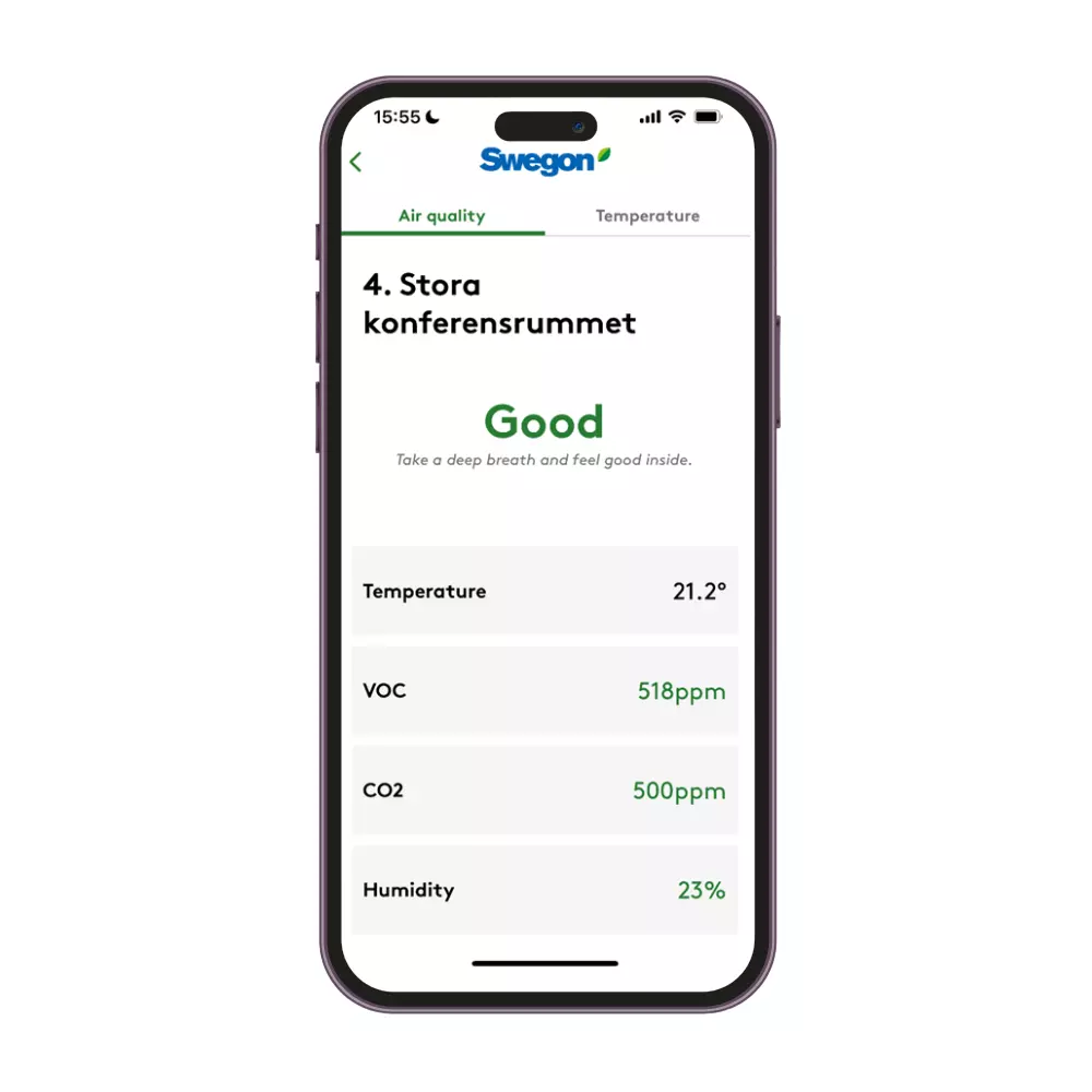 To assure the user that they are surrounded by healthy air, the app shows the status of various parameters such as CO2, VOC and humidity. The values for each parameter is presented by clear keyword that indicates if the value is healthy or not. Click on the parameter to read more information about it, see the thresholds and receive advice on how to improve the IEQ. The range of parameters to be shown in the app is depending on which types of sensors that are installed in the room.